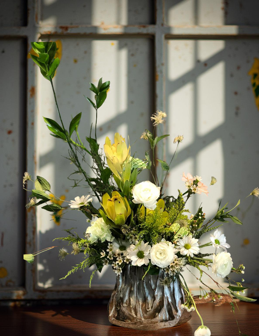 We arrange flowers like writing poems in silence.Every branch, curve, and shadow carries a feeling we can’t name—but we know it when we see it