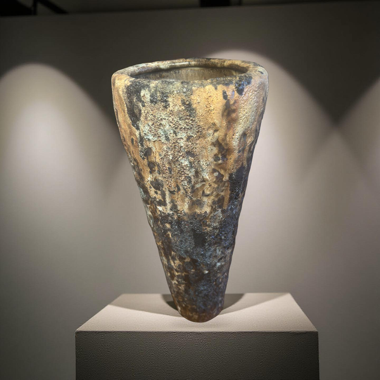 A tall, hand-built ceramic vessel with a raw, volcanic surface — where ash tones, mineral blues, and weathered bronze hues melt into each other like eroded stone.